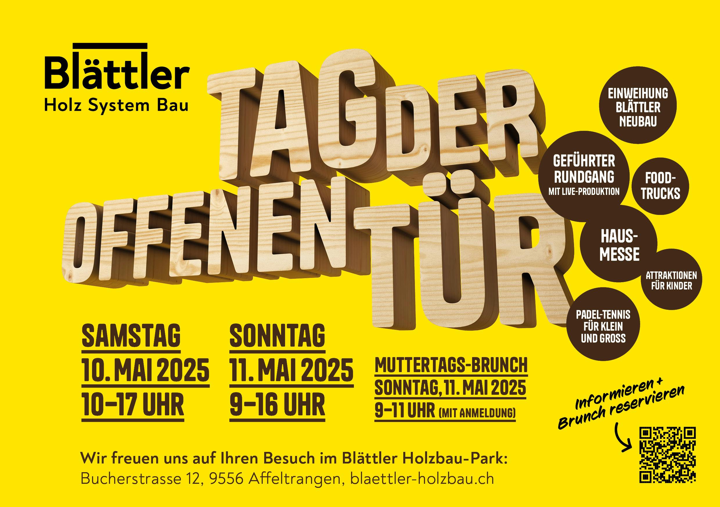 Sie möchten genauer wissen, wer hinter dem Neubauprojekt steht? Es wartet die perfekte Gelegenheit auf Sie. Denn wir laden Sie zu unserem Tag der offenen Tür am 10./11. Mai 2025 in Affeltrangen TG ein. Mit Stolz führen wir Sie durch unseren 46’000m2 grossen Holzbau-Park, in welchem vielleicht schon bald Ihr neues Zuhause produziert wird.